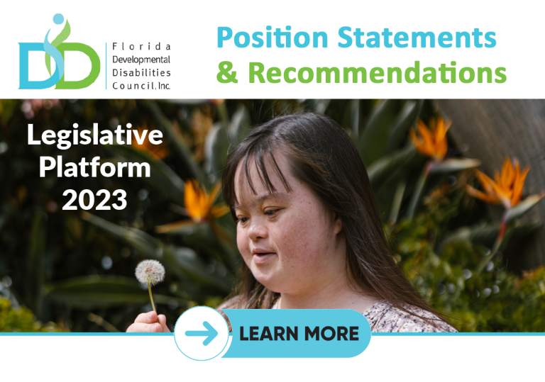 Each year the Florida Developmental Disabilities Council develops and approves a Legislative Platform that includes priorities identified by stakeholders, family members, and self-advocates.